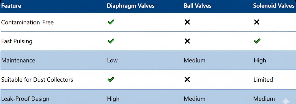 • Dust Collector Systems: Pulse jet bag filters rely on diaphragm valves to deliver consistent air bursts.